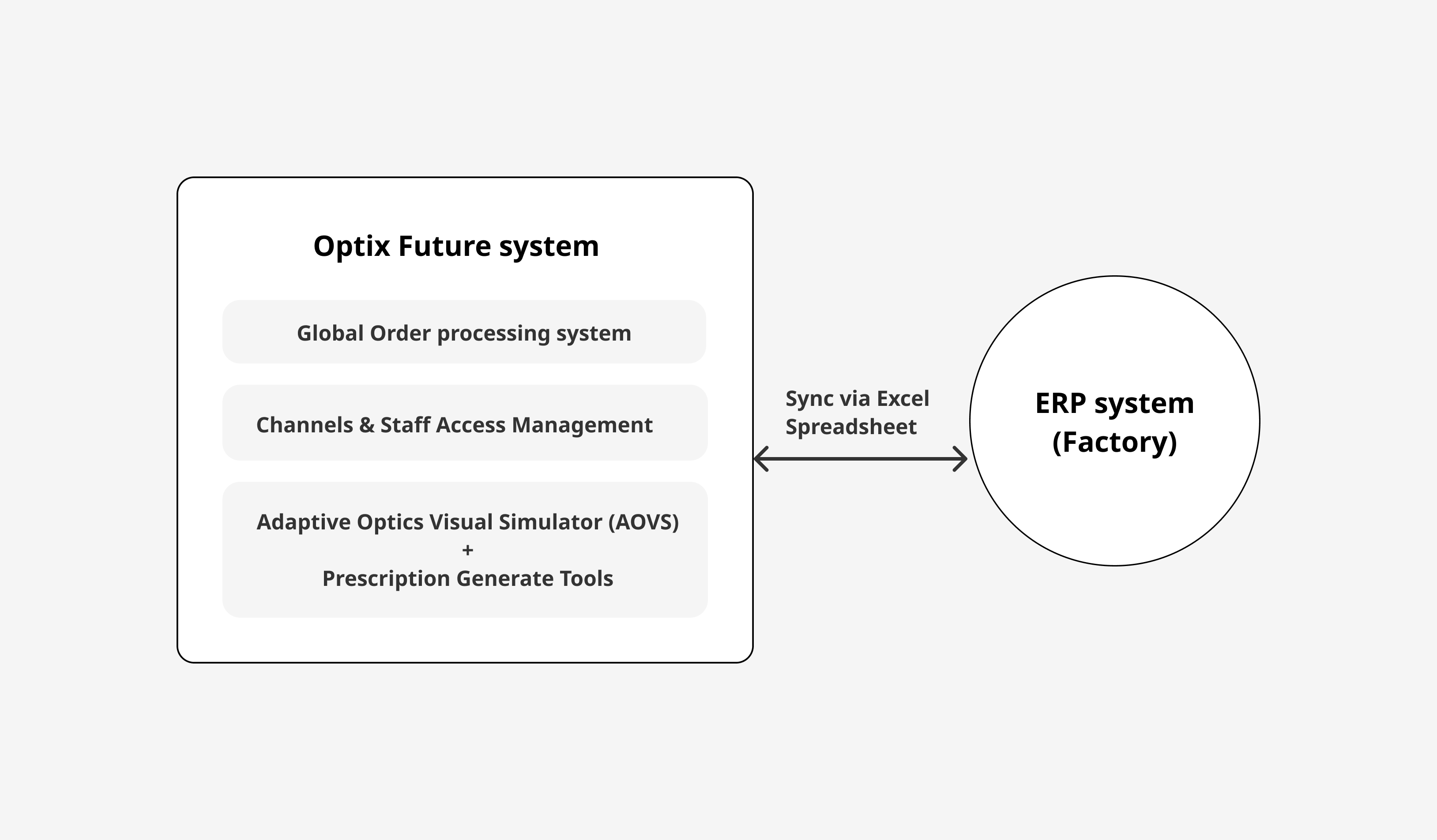 The current Optix systems include the domestic order system, the overseas order system, and the ERP system of the factory. As the domestic and overseas systems have their unique logic and users, the two are linked to the ERP-- data is synchronized by importing Excel spreadsheets.