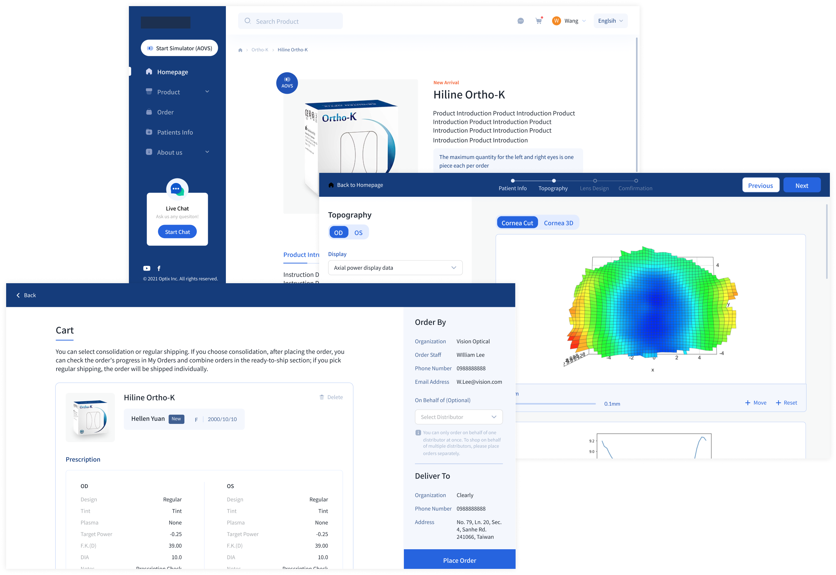 Provides simulation (AOVS) technology that can help replace the analog testing process. Obtaining patient information and corneal photos via topography produces a 3D real-time interactive simulation map that simulates different corneal conditions according to different input values, providing doctors with intuitive feedback and prescription suggestions.